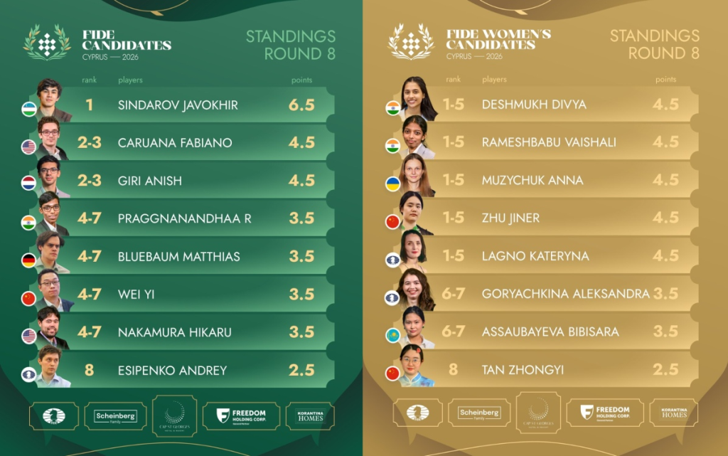 In the FIDE Women’s Candidates, Anna Muzychuk lost to Divya Deshmukh, leaving five players tied for the lead and the tournament wide open. Three decisive outcomes in Round 8 highlight the remarkable balance and competitiveness of the women’s field.